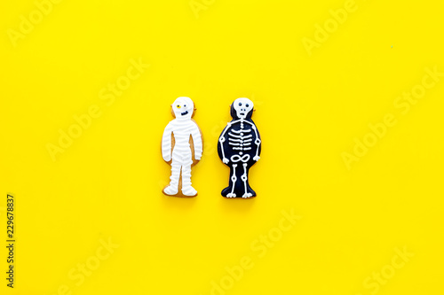 Fototapeta premium Halloween traditions. Halloween gingerbread in shape of evil characters on yellow background top view space for text