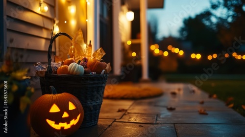Fototapeta premium Halloween trick-or-treat fun with creepy lawn decor, friendly monsters and candy-filled baskets