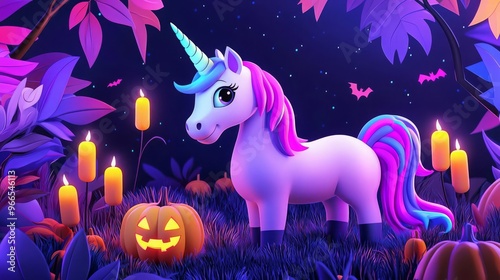 Fototapeta premium Halloween Unicorn Witch unicorn casting spells, floating candles and glowing pumpkins, Halloween scene, 3D illustration