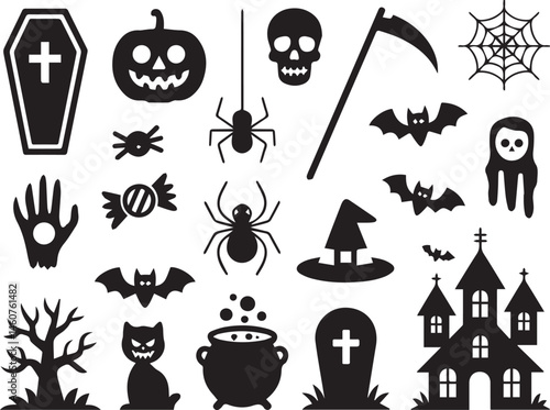 Obraz premium Halloween vector silhouette set with coffin pumpkin spider castle and witch...
