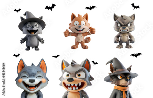 © Only Best PNG's, Naklejka premium Halloween werewolf set collection with various expressions: angry, happy, funny in close-up, half-body, and full-body in 3D cartoon illustration, Isolated on Transparent Background, PNG
