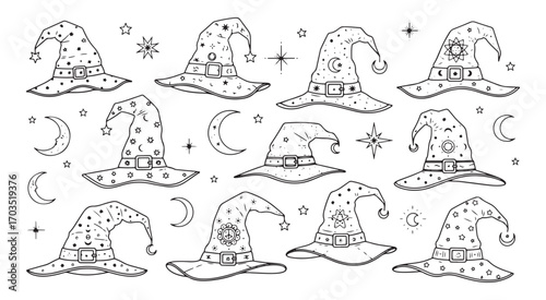 Naklejka premium Halloween Witch Hat Pattern with Stars and Crescent Moon Line Art Vector