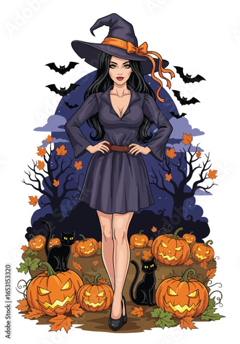 Fototapeta premium Halloween witch pin-up illustration with black cats, flying bats, jack-o’-lantern pumpkins, and autumn leaves, perfect spooky fantasy artwork for Halloween celebration themes