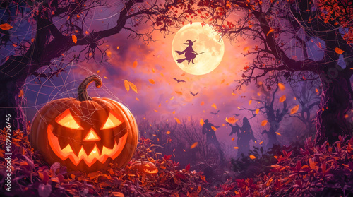 © Natallia, Fototapeta premium Halloween with a dark blue and purple sky, filled with bats flying and a pumpkin. 3D render