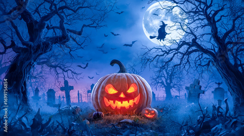 © Natallia, Naklejka premium Halloween with a dark blue and purple sky, filled with bats flying and a pumpkin. 3D render