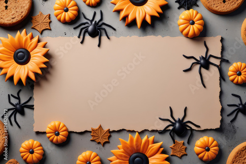 © elena_hramowa, Obraz premium Halloween with cookies, leaves and spiders on concrete background with space for text.