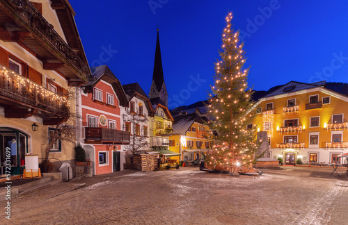 Fototapeta premium Hallstatt. Old town square with a Christmas tree on Christmas night.