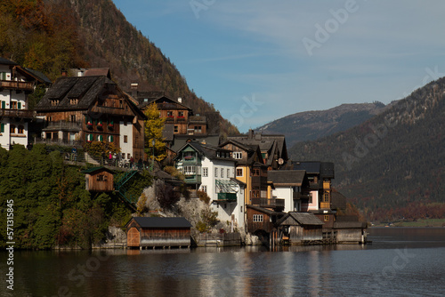 Fototapeta premium hallsttat mountain village surrounded by lakes and trees in autumn