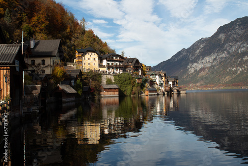 Fototapeta premium hallsttat mountain village surrounded by lakes and trees in autumn
