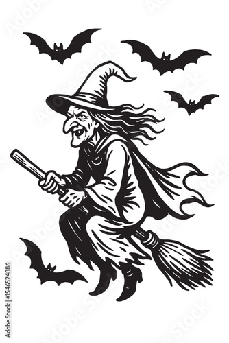 © Vector Nests, Fototapeta premium Haloween Witch drawing black and white