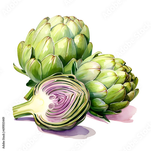 Fototapeta premium Halph artichoke composition, watercolor illustration, violet and green colors, Generative AI