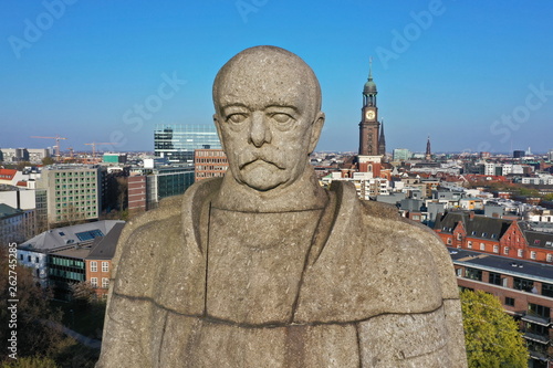Fototapeta premium Hamburg. Bismarck Denkmal vor der Skyline mit Michel, Elbphilharmonie, Hafen. Luftaufnahme.