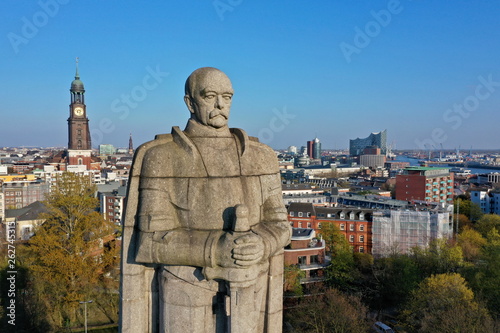 Fototapeta premium Hamburg. Bismarck Denkmal vor der Skyline mit Michel, Elbphilharmonie, Hafen. Luftaufnahme.
