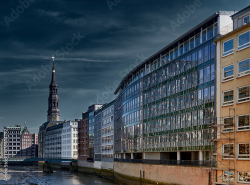 © A-D-F, Obraz premium HAMBURG, GERMANY - MARCH 26, 2016: A dry waterway and the facades of the surrounding buildings are touched by mystic light