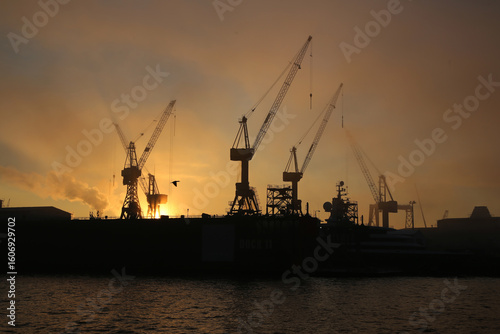 Obraz premium Hamburger Hafen bei Sonnenaufgang im Winter
