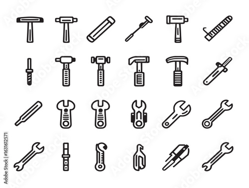 © Safowan, Naklejka premium Hammer and wrench tools icons in outlined repair vector illustration