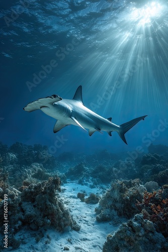 Fototapeta premium Hammerhead shark in the underwater world. Observing ocean wildlife.