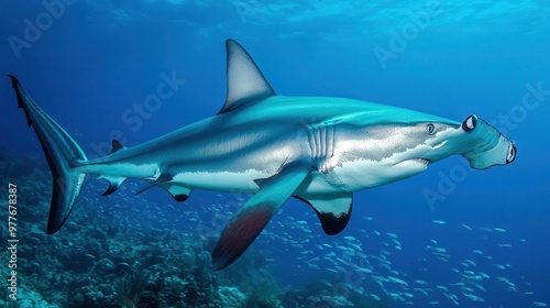 Naklejka premium Hammerhead shark patrolling the open ocean, sleek and powerful, schools of...