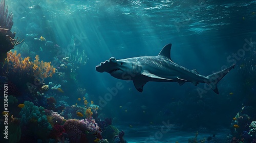 © rehan, Fototapeta premium Hammerhead Shark Swimming Through Vibrant Coral Reef