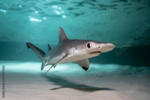 © Musfik, Fototapeta premium Hammerhead shark swims in clear blue ocean water over sandy seabed
