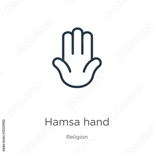 © Premium Art, Fototapeta premium Hamsa hand icon. Thin linear hamsa hand outline icon isolated on white background from religion collection. Line vector sign, symbol for web and mobile