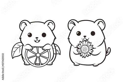 Fototapeta premium Hamster holding a sunflower seed, sitting inside a tiny wheel. Cute Cartoon Character Design and Computer Game. Coloring Book Outline Set.