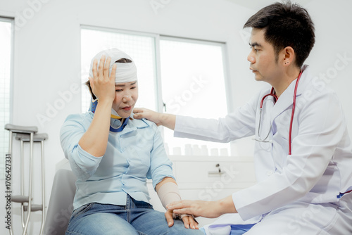 © Worapon, Obraz premium Hand bandages, human bandages, and first aid bandages. Teaching or tutoring with care, attention, or assistance in the office. Emergency nurse.