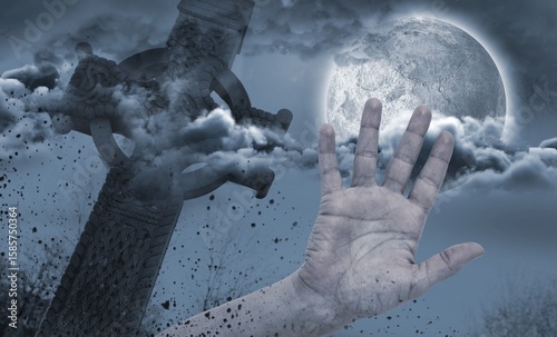© vectorfusionart, Naklejka premium Hand by side of celtic cross in front of moon
