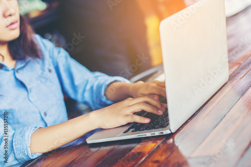 © chaunpis, Naklejka premium hand control on a laptop touchpad