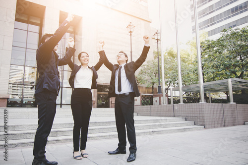 Fototapeta premium Hand coordination of team businessman on sky infront of bank building, office after successful project.