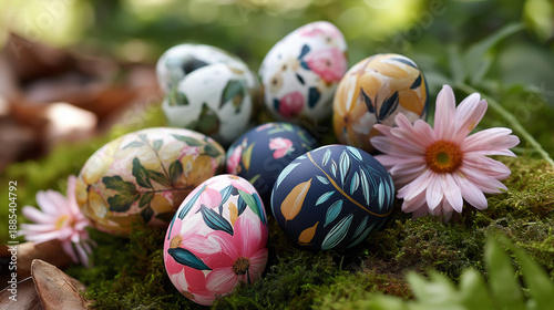 Obraz premium Hand-decorated easter eggs with floral patterns nestled on moss surrounded by...