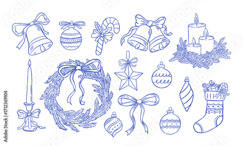 © Nadezhda Mih, Naklejka premium Hand draw set of Christmas wreath, decor, fir tree branches, candle, bow, balls and bells. Holidays decoration in doodle style. New Year design. Vector illustration.