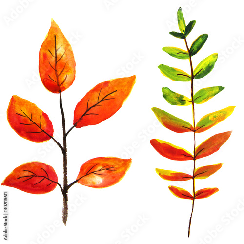 Obraz premium Hand-drawing watercolor pencils on paper - beautiful red and yellow autumn leaves. Isolated illustration on white background