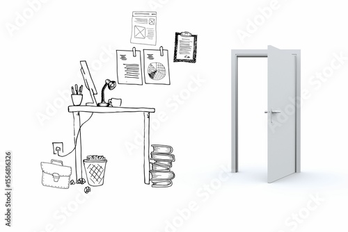 © vectorfusionart, Naklejka premium Hand-drawing workspace sketch blending into 3D-rendered open white door on white studio background