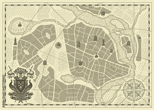 © paseven, Fototapeta premium Hand-drawn abstract city map with ornate Coat of arms, wind rose and compass sign in vintage style. Monochrome vector urban roads plan on an old paper. Town streets with parks, river and landmarks