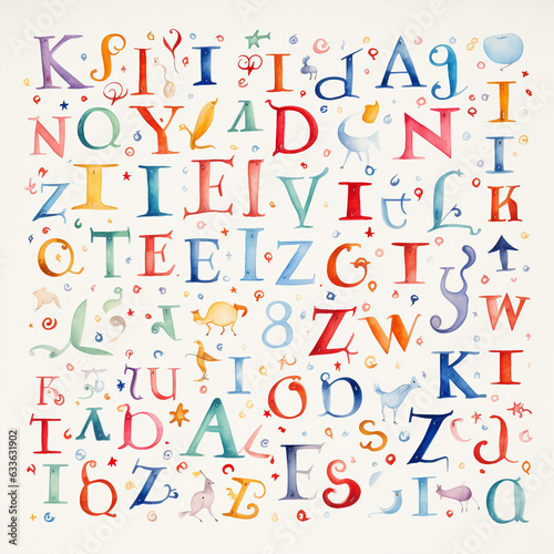 © Kateryna, Fototapeta premium hand drawn alphabet, colored English letters on a white background, background, AI generator