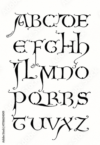 © The Nature Notes, Fototapeta premium Hand-drawn alphabet created with ink and pen. Artistic black lettering in elegant ornamental style on white background.