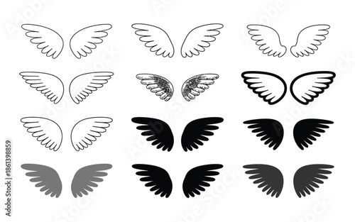 © MstAsmaAkter, Fototapeta premium Hand Drawn Angel and Bird Wings Vector Collection in Outline and Silhouette Styles