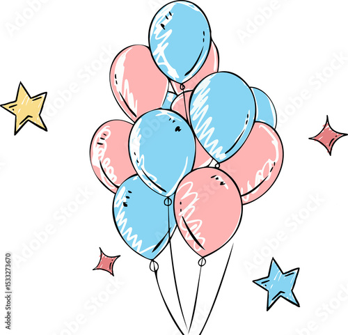 © vectorfusionart, Fototapeta premium hand-drawn art is showing pastel pink-blue balloons, black strings and stars on transparent bg