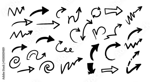 © JollyRita, Obraz premium Hand drawn black arrow collection points in various directions on a white background with different styles and shapes.