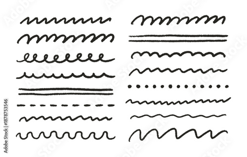 © Vodoleyka, Fototapeta premium Hand drawn black crayon strokes, underlines, smears, strikethroughs, curls, wavy lines set. Pencil squiggles elements. Doodle style chalk sketches. Vector illustration