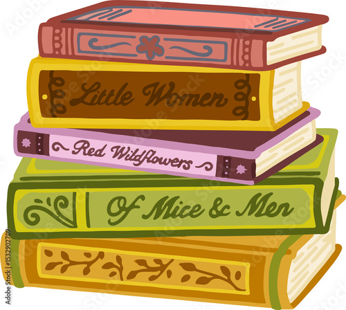 © vectorfusionart, Naklejka premium Hand-drawn book stack is featuring Little Women Red Wildflowers Of Mice and Men, transparent backgro