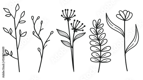 © Khulqi Design, Naklejka premium Hand drawn botanical leaves and flowers line art collection