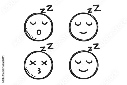 Fototapeta premium Hand Drawn Cartoon Sleepy Face Emoji Set with Zzz, Closed Eyes, Peaceful,...