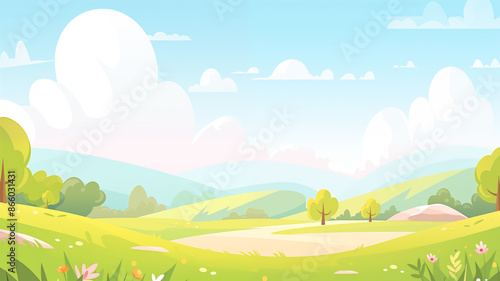 © 俊后生, Obraz premium Hand drawn cartoon summer outdoor landscape illustration background