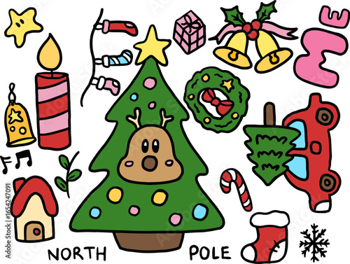 Obraz premium Hand drawn Christmas illustrations of Christmas tree and reindeer, candle, wreath, car, candy cane, bell, Santa sock, home, gift box, snowflake for decorations, sticker, cartoon, icons, cartoon, signs