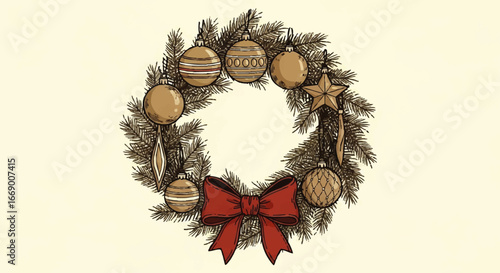 Naklejka premium Hand-drawn Christmas wreath with golden ornaments and a red bow.