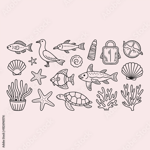 Fototapeta premium Hand- Drawn Collection of Marine Life and Ocean Objects fish turtle