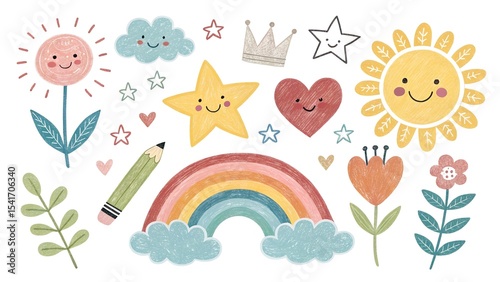 © PAVEL, Naklejka premium Hand drawn crayon child pencil style icon set. Cute rainbow, heart, crown, flower and sun in colorful kid doodle style. Chalk texture, cloud, smile, star and sketch figure for play or school design