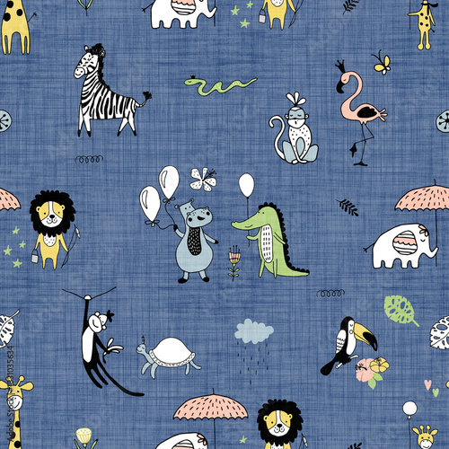 © Nata789, Obraz premium Hand drawn cute funny animals tropical seamless pattern background